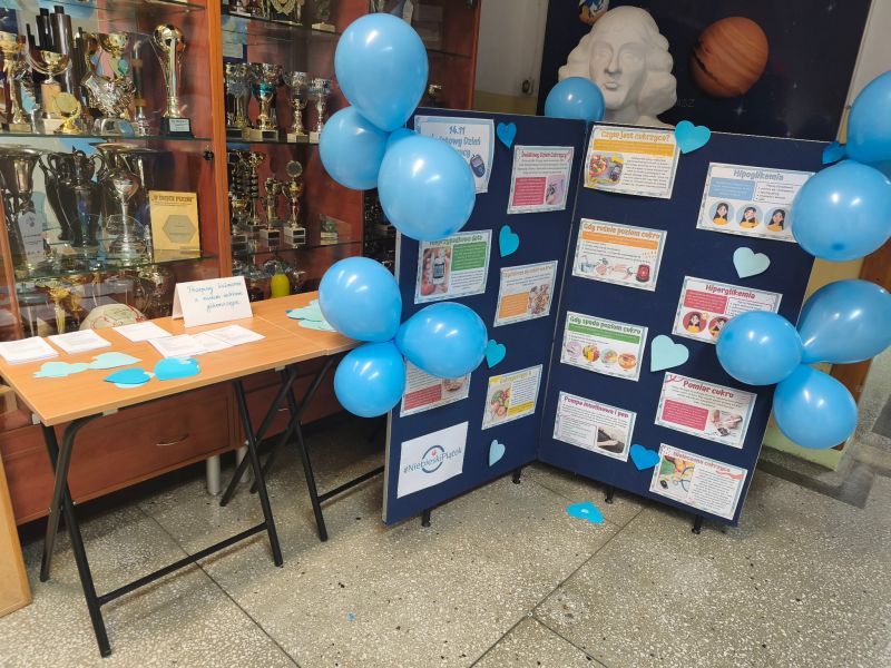 Na szkolnych korytarzach pojawiły się gazetki tematyczne oraz hasła promujące zdrowie, udekorowane niebieskimi balonami – symbolem solidarności z osobami chorymi na cukrzycę. W całej szkole obchodzono także „Dzień bez cukru” – uczniowie zostali zachęceni do przyniesienia owoców i zdrowych przekąsek zamiast tradycyjnych słodyczy.