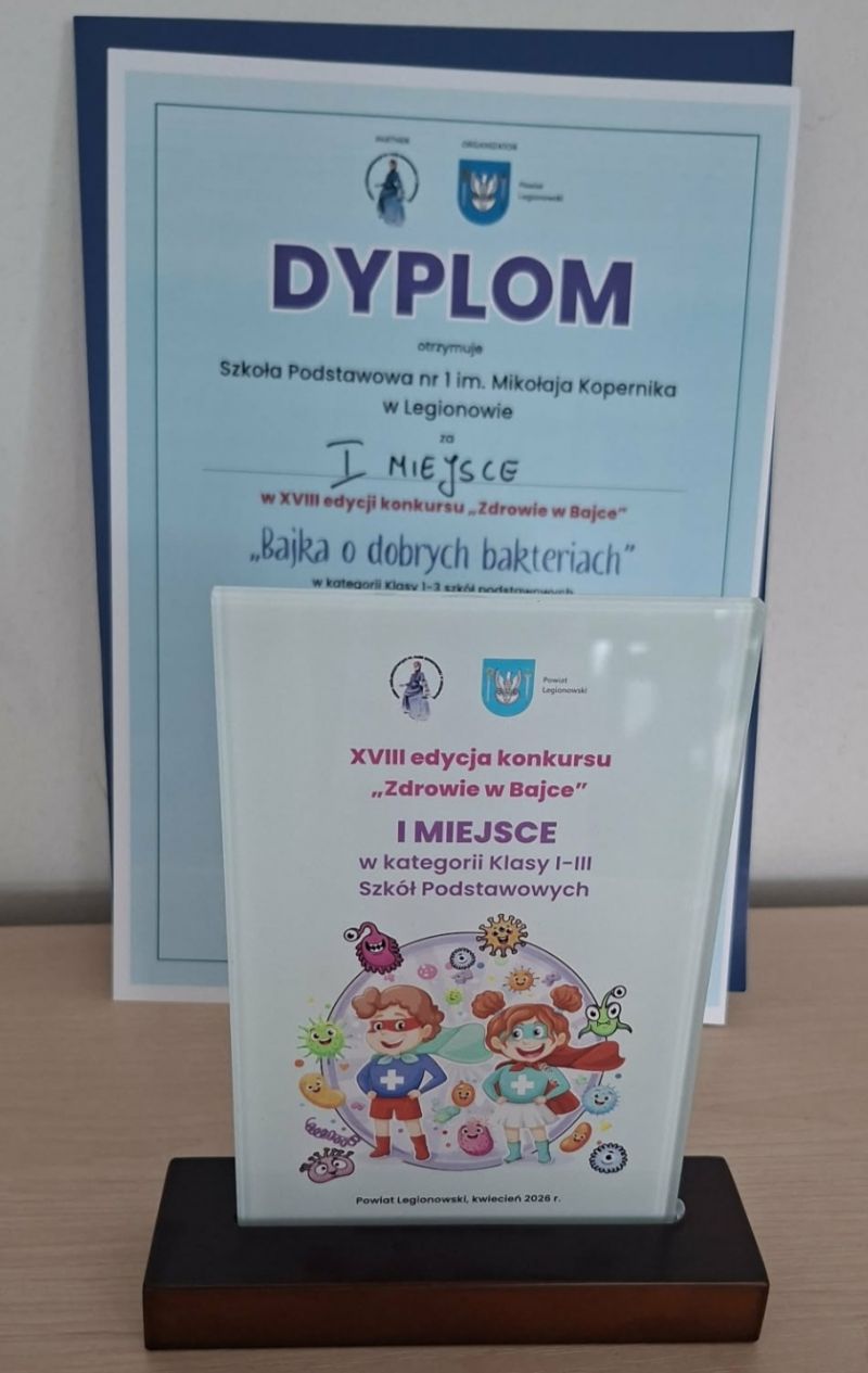 Dziś w Ratuszu Miejskim w Legionowie odbyl sie Powiatowy Konkurs "Zdrowie w Bajce". Z radością informujemy, że uczniowie klasy 2c naszej szkoły odnieśli wielki sukces, zdobywając I miejsce w konkursie z przedstawieniem "Zdrowe brzuszki mamy, gdy o nie dbamy". Nasi reprezentanci wykazali się kreatywnością i talentem aktorskim opowiadając za pomocą słów, piosenki i tańca o tym jak dobre bakterie pomagają zdrowiej żyć. Serdecznie gratulujemy uczniom i życzymy dalszych sukcesów.