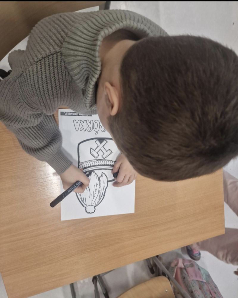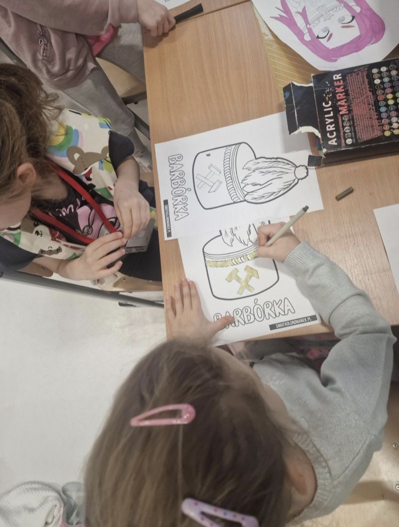 Dnia 4 grudnia 2025 roku podczas zajęć świetlicowych w świetlicy szkolnej przeprowadzono zajęcia tematyczne poświęcone Barbórce. W ramach zajęć odbyła się rozmowa o tradycjach Barbórki i pracy górnika, a uczniowie klasy 1a wykonali pracę plastyczną – czapkę górniczą (czako).