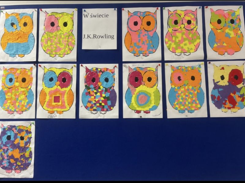 W ramach projektu edukacyjnego „Świetliczaki na tropie… ludzi z pasją” uczniowie klasy 3a wykonywali prace plastyczne inspirowane twórczością J.K. Rowling oraz magicznym światem Harry’ego Pottera. Dzieci stworzyły niezwykłe sowy, pracując techniką mozaiki.