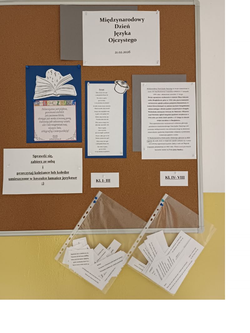 21.02 obchodziliśmy w szkole Międzynarodowy Dzień Języka Ojczystego. Z okazji rocznicy obchodów biblioteka przygotowała dla uczniów naszej szkoły wyzwanie językowe polegające na wylosowaniu fragmentu tekstu i przeczytaniu go koleżance lub koledze. Tekst zaliczany był do tzw. łamańców językowych, więc stanowił nie lada wyzwanie, szczególnie dla najmłodszych uczniów. Teksty te podzielone były na dwie kategorie wiekowe ( kl. I-III oraz IV-VIII), a wywieszone zostały na tablicy ogłoszeń bibliotecznych razem z informacją na pamiątkę czego obchodzony jest ten dzień.